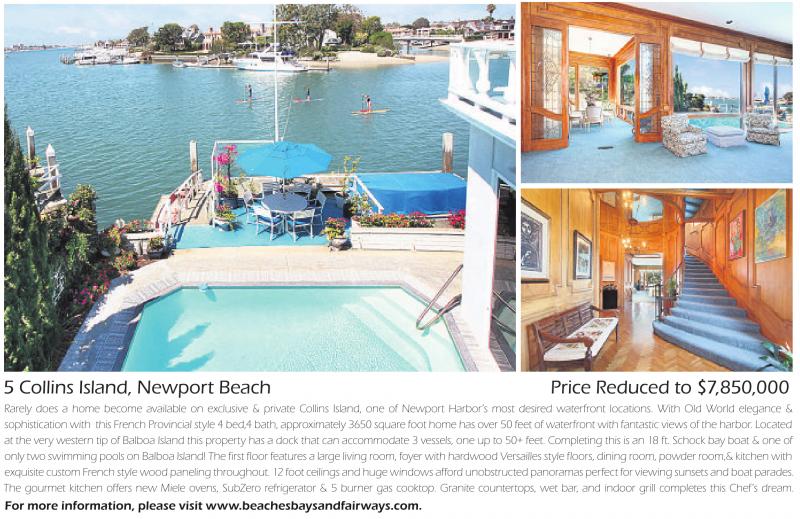 5 Collins Island, Newport Beach Price Reduced to $7,850,000 Rarely does a home become available on exclusive & private Collins Island, one of Newport Harbor’s most desired waterfront locations. With Old World elegance & sophistication with this French Provincial style 4 bed,4 bath, approximately 3650 square foot home has over 50 feet of waterfront with fantastic views of the harbor. Located at the very western tip of Balboa Island this property has a dock that can accommodate 3 vessels, one up to 50+ feet. Completing this is an 18 ft. Schock bay boat & one of only two swimming pools on Balboa Island! The first floor features a large living room, foyer with hardwood Versailles style floors, dining room, powder room,& kitchen with exquisitecustomFrenchstyle wood paneling throughout.12footceilingsand huge windowsaffordunobstructed panoramasperfect forviewing sunsets andboatparades. The gourmet kitchen offers new Miele ovens, SubZero refrigerator & 5 burner gas cooktop. Granite countertops, wet bar, and indoor grill completes this Chef’s dream. For more information, please visit www.beachesbaysandfairways.com.