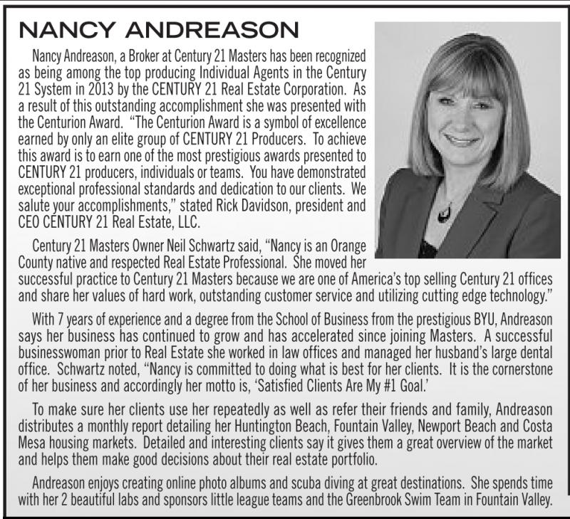 Century21Masters OwnerNeilSchwartzsaid, “Nancy is an Orange County native andrespected Real Estate Professional. She movedher successfulpracticetoCentury 21 Mastersbecause we areone of America’stop selling Century21offices and share her values of hard work, outstanding customer service and utilizing cutting edge technology.”