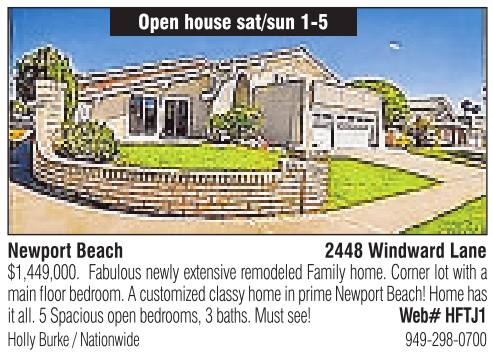 Open house sat/sun 1-5 Newport Beach 2448 Windward Lane $1,449,000. Fabulous newly extensive remodeled Family home. Corner lot with a main floor bedroom. Acustomized classy home in prime NewportBeach! Home has it all. 5Spacious open bedrooms, 3baths. Must see! Web# HFTJ1 Holly Burke /Nationwide 949-298-0700