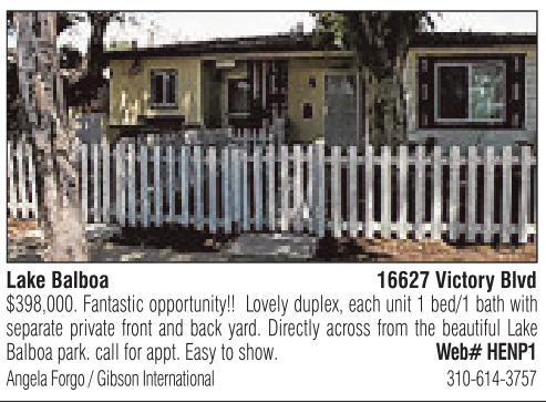 Lake Balboa 16627 VictoryBlvd $398,000. Fantastic opportunity!! Lovely duplex, each unit 1bed/1 bath with separate private front and back yard. Directly across from the beautiful Lake Balboa park. call for appt. Easy to show. Web# HENP1 Angela Forgo /Gibson International 310-614-3757