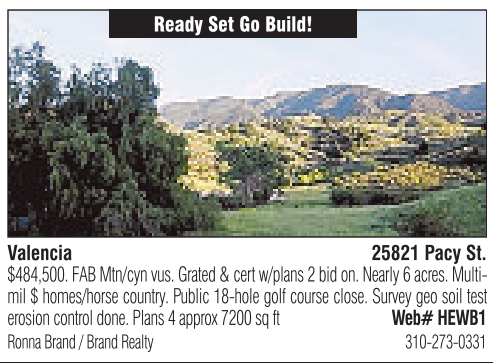 Ready Set Go Build! Valencia 25821 Pacy St. $484,500. FAB Mtn/cyn vus. Grated &certw/plans 2bid on. Nearly 6acres. Multimil $homes/horse country.Public 18-hole golf course close. Survey geo soil test erosion control done. Plans 4approx 7200 sq ft Web# HEWB1 Ronna Brand /Brand Realty 310-273-0331