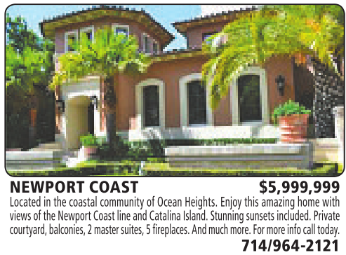 NEWPORT COAST $5,999,999 Located in the coastal community ofOcean Heights. Enjoy this amazing home with viewsofthe NewportCoast line andCatalinaIsland.Stunningsunsetsincluded. Private courtyard,balconies, 2master suites, 5fireplaces. Andmuch more.For more infocalltoday. 714/964-2121