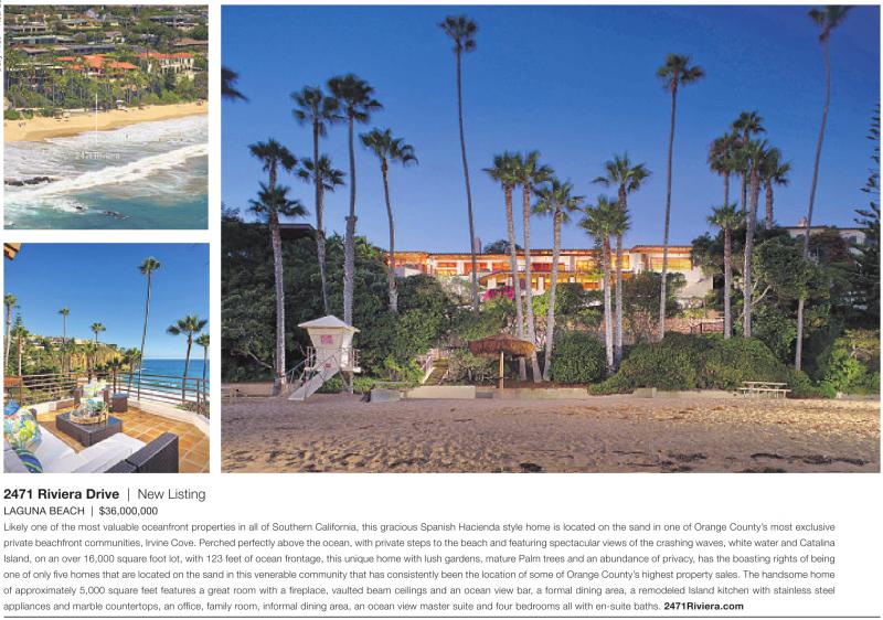 2471 Riviera Drive | New Listing LAGUNA BEACH | $36,000,000 Likely one of the most valuable oceanfront properties in all of Southern California, this gracious Spanish Hacienda style home is located on the sand in one of Orange County’s most exclusive private beachfront communities, Irvine Cove. Perched perfectly above the ocean, with private steps to the beach and featuring spectacular views of the crashing waves, white water and Catalina Island, on an over 16,000 square foot lot, with 123 feet of ocean frontage, this unique home with lush gardens, mature Palm trees and an abundance of privacy, has the boasting rights of being 2471Riviera.com