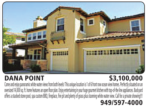 DANA POINT $3,100,000 Come and enjoy panoramicwhitewaterviewsfrom both levels!This unique location is 1of6frontrow ocean view homes. Perfectly situatedonan oversized14,000 sq. ft.home features an openfloor plan. Enjoy entertaininginyour huge gourmet kitchen with top-of-the line appliances. Backyard offersastacked stone pool, spacustomBBQ,fireplace,fire pit andplentyofgrassplusstunningwhitewaterview.Callfor aprivate showing!!! 949/597-4000 See also