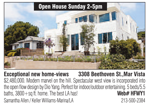 Exceptional new home-views Open House Sunday 2-5pm 3308 Beethoven St.,Mar Vista $2,480,000. Modern marvel on the hill. Spectacular west view is incorporated into the open flow design by Dio Yang. Perfect for indoor/outdoor entertaining. 5beds/5.5 baths, 3800+sq ft. home. The best LA has! Web# HFWY1 Samantha Allen /Keller Williams-Marina/LA 213-500-2384