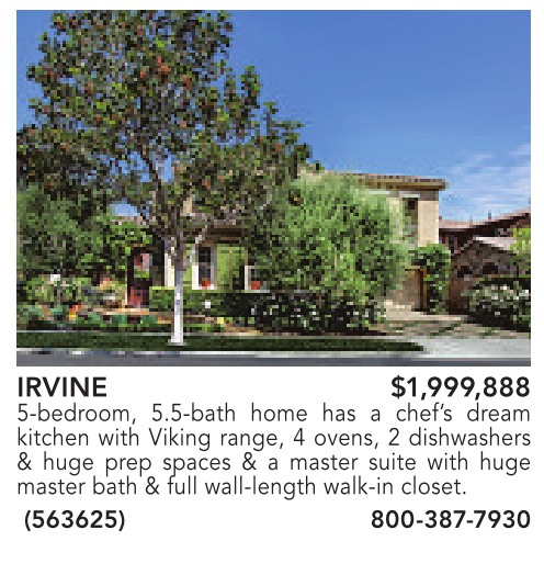 IRVINE $1,999,888 5-bedroom, 5.5-bath home has a chef’s dream kitchen with Viking range, 4 ovens, 2 dishwashers & huge prep spaces & a master suite with huge master bath & full wall-length walk-in closet.