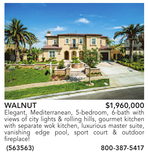WALNUT $1,960,000 Elegant, Mediterranean, 5-bedroom, 6-bath with views of city lights & rolling hills, gourmet kitchen with separate wok kitchen, luxurious master suite, vanishing edge pool, sport court & outdoor fireplace!