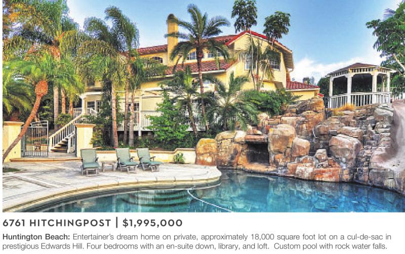 6761 HITCHINGPOST | $1,995,000 Huntington Beach: Entertainer’s dream home on private, approximately 18,000 square foot lot on a cul-de-sac in prestigious Edwards Hill. Four bedrooms with an en-suite down, library, and loft. Custom pool with rock water falls.