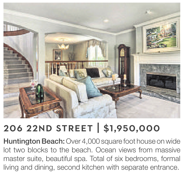 206 22ND STREET | $1,950,000 Huntington Beach: Over 4,000 squarefoot house on wide lot two blocks to the beach. Ocean views from massive master suite, beautiful spa. Total of six bedrooms, formal living and dining, second kitchen with separate entrance.