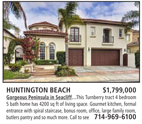 HUNTINGTON BEACH $1,799,000 Gorgeous Peninsula in Seacliff…This Turnberry tract 4bedroom 5bath home has 4200 sqftofliving space. Gourmet kitchen, formal entrance with spiral staircase, bonus room, office, large family room, butlerspantryandsomuch more.Calltosee 714-969-6100 See also
