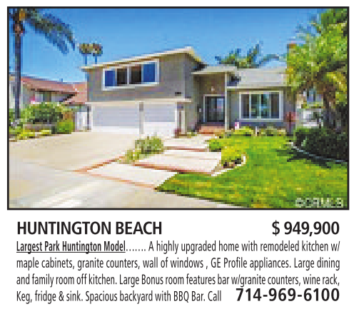 HUNTINGTONBEACH $949,900 Largest Park Huntington Model……. Ahighly upgraded home with remodeled kitchen w/ maple cabinets, granite counters, wall of windows ,GE Profile appliances. Large dining andfamilyroomoff kitchen. Large Bonus room featuresbar w/granite counters, wine rack, Keg, fridge &sink. Spacious backyard with BBQ Bar.Call 714-969-6100