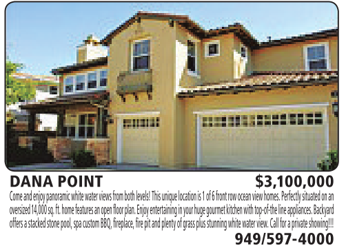 DANA POINT $3,100,000 Come and enjoy panoramicwhitewaterviewsfrom both levels!This unique locationis1of6frontrow ocean view homes. Perfectly situatedonan oversized14,000 sq. ft.home features an openfloor plan. Enjoy entertaininginyour huge gourmet kitchen with top-of-the line appliances. Backyard offersastacked stone pool, spacustomBBQ,fireplace,fire pit andplentyofgrassplusstunningwhitewaterview.Callfor aprivate showing!!! 949/597-4000 See also
