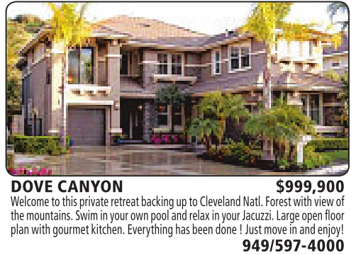 DOVE CANYON $999,900 Welcome to this private retreat backinguptoClevelandNatl. Forest with view of themountains.Swiminyour ownpooland relaxinyour Jacuzzi.Large openfloor plan with gourmet kitchen. Everythinghas beendone !Just move in andenjoy! 949/597-4000 See also
