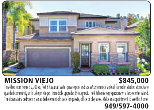 MISSION VIEJO $845,000 This 4bedroomhome is 2,700sq. feet &has asalt water private pooland spaw/customrockslide allframed in stacked stone.Gate guarded communitywithLakeprivileges. Incredible upgrades throughout.The kitchen is very spaciousw/alarge centerisland. Thedownstairsbedroomisanadded element of space for guests, officeorplay area. Makeanappointmenttosee this home!
