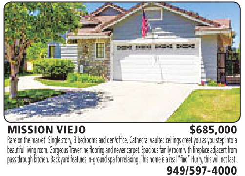 MISSION VIEJO $685,000 Rare on the market! Single story, 3bedrooms and den/office. Cathedral vaulted ceilings greet you as you step into a beautifulliving room. Gorgeous Travertineflooring andnewer carpet.Spaciousfamilyroomwithfireplace adjacent from pass through kitchen. Backyardfeaturesin-ground spafor relaxing. This home is areal “find”Hurry,this will notlast! 949/597-4000 See also