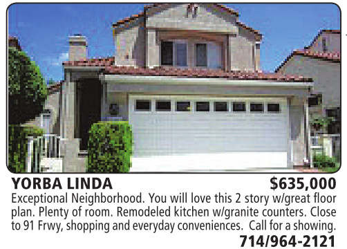 YORBA LINDA $635,000 Exceptional Neighborhood. You will love this 2story w/great floor plan. Plenty of room. Remodeled kitchen w/granite counters. Close to 91 Frwy,shoppingand everyday conveniences. Call forashowing.