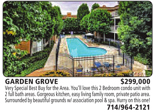 GARDEN GROVE $299,000 Very SpecialBestBuy for theArea. You’ll love this 2Bedroomcondounitwith 2fullbathareas.Gorgeous kitchen,easyliving family room,privatepatio area. Surrounded by beautifulgroundsw/associationpool&spa. Hurryonthis one! 714/964-2121 See also