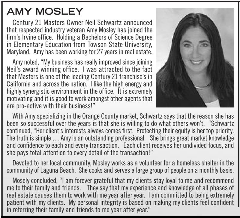 Century 21 Masters Owner Neil Schwartz announced that respected industry veteran Amy Mosley has joined the firm’s Irvine office. Holding a Bachelors of Science Degree in Elementary Education from Towson State University, Maryland, Amy has been working for 27 years in real estate.