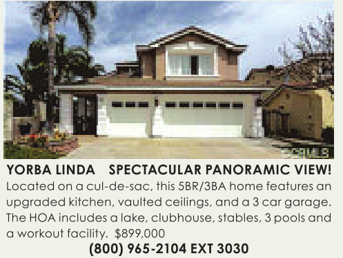 YORBA LINDA SPECTACULAR PANORAMIC VIEW! Located onacul-de-sac, this 5BR/3BA home features an upgraded kitchen, vaulted ceilings, and a3car garage. The HOA includes alake, clubhouse, stables, 3pools and aworkout facility. $899,000 (800)965-2104 EXT 3030
