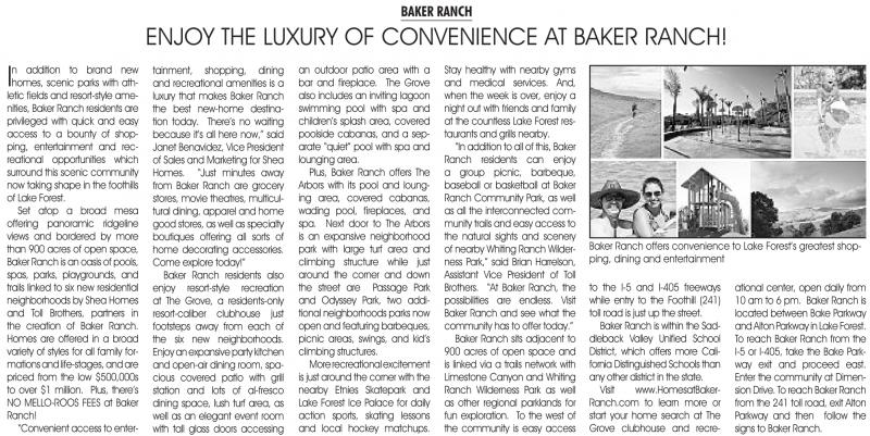 tainment, shopping, dining and recreational amenities is aluxury that makes Baker Ranch the best new-home destination today. There’s no waiting because it’s all here now,” said janet Benavidez, vice President of Sales and Marketing for Shea