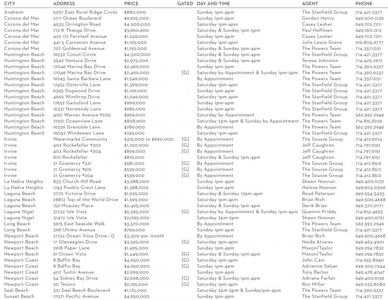 CITY ADDRESS PRICE GATED DAY AND TIME AGENT PHONE Anaheim 5297 East Rural Ridge Circle $880,000 Sunday 1pm-4pm The Stanfield Group 714.421.3377 Corona del Mar 2711 Ocean Boulevard $9,995,000 Sunday 1pm-4pm Gordon Henry 949.500.1236 Corona del Mar 4533 Orrington Road $4,500,000 Saturday 1pm-4pm Casey Lesher 949.702.7211 Corona del Mar 712 K Thanga Drive $3,960,600 Saturday & Sunday 1pm-5pm Paul Hoffman 949.760.1212 Corona del Mar 425 1/2 Fernleaf Avenue $1,249,000 Sunday 1pm-4pm Casey Lesher 949.702.7211 Corona del Mar 441.5 Carnation Avenue $1,195,000 Saturday 1pm-4pm Julie Lewis-Grenz 916.804.6777 Corona del Mar 707 Goldenrod Avenue $1,195,000 Saturday & Sunday 1pm-4pm The Powers Team 714.357.1031 Huntington Beach 16532 Cotuit Circle $4,500,000 Saturday & Sunday 1pm-4pm The Stanfield Group 714.421.3377 Huntington Beach 3542 Venture Drive $2,975,000 Saturday & Sunday 1pm-4pm Teresa Johnston 714.425.2912 Huntington Beach 17046 Marina Bay Drive $2,499,000 Sunday 1pm-5pm The Powers Team 714.390.6337 Huntington Beach 17046 Marina Bay Drive $2,499,000 [G] Saturday by Appointment & Sunday 1pm-5pm The Powers Team 714.390.6337 Huntington Beach 16245 Santa Barbara Lane $1,549,000 By Appointment The Powers Team 714.357.1031 Huntington Beach 17432 Osterville Lane $1,399,000 Saturday 1pm-4pm The Stanfield Group 714.421.3377 Huntington Beach 6395 Dogwood Drive $1,199,000 Sunday 1pm-4pm The Stanfield Group 714.421.3377 Huntington Beach 4692 Winthrop Drive $1,049,000 Saturday 1pm-4pm The Stanfield Group 714.421.3377 Huntington Beach 17652 Gainsford Lane $999,000 Sunday 1pm-4pm The Stanfield Group 714.421.3377 Huntington Beach 16331 Normandy Lane $989,000 Sunday 1pm-4pm The Stanfield Group 714.421.3377 Huntington Beach 4167 Warner Avenue #205 $969,000 Saturday by Appointment The Powers Team 562.592.2946 Huntington Beach 21931 Oceanview Lane $808,900 Saturday 2pm-5pm & Sunday by Appointment The Powers Team 714.815.8226 Huntington Beach 16329 Grenoble Lane $789,000 By Appointment The Powers Team 562.592.2946 Huntington Beach 16052 Windemeir Lane $749,000 Saturday 1pm-4pm The Stanfield Group 714.421.3377 Irvine Watermarke Community $315,000 to $690,000 [G] By Appointment The Sousse Group 714.412.9014 Irvine 402 Rockefeller #302 $1,250,000 [G] By Appointment Jeff Caughren 714.797.6151 Irvine 402 Rockefeller #304 $899,000 [G] By Appointment Jeff Caughren 714.797.6151 Irvine 810 Rockefeller $819,000 Saturday & Sunday 1pm-4pm Jeff Caughren 714.797.6151 Irvine 21 Gramercy #321 $581,000 [G] By Appointment The Sousse Group 714.412.8512 Irvine 21 Gramercy #419 $559,000 [G] By Appointment The Sousse Group 714.412.8512 Irvine 21 Gramercy #204 $539,900 [G] By Appointment The Sousse Group 714.412.8512 La Habra Heights 833 Church Hill Road $3,988,000 Sunday 1pm-4pm Shawn Noonan 949.400.0751 La Habra Heights 1743 Pueblo Crest Lane $1,388,000 Sunday 1pm-4pm Helena Noonan 949.903.0306 Laguna Beach 2779 Victoria Drive $1,695,000 Saturday & Sunday 12pm-4pm Reed Peterson 949.554.3435 Laguna Beach 28812 Top of the World Drive $1,599,000 Saturday 1pm-4pm Brian Rich 949.500.4668 Laguna Beech 152 Mcaulay Place $2,495,000 Saturday & Sunday 1pm-4pm Derik Brian 949.370.0771 Laguna Nigel 31732 Isle Vista $5,295,000 [G] Saturday by Appointment & Sunday 1pm-4pm Quentin Priddy 714.814.4663 Laguna Nigel 31472 Isle Vista $2,095,000 Saturday 2pm-5pm Shawn Noonan 949.400.0751 Long Beach 5915 East Seaside Walk $3,570,000 By Appointment The Powers Team 562.592.2946 Long Beach 398 Ultimo Avenue $799,000 Sunday 1pm-4pm The Stanfield Group 714.421.3377 Newport Beach 21722 Ocean Vista Drive – G $3,300 per month By Appointment Brian Rich 949.500.4668 Newport Beach 17 Gleneagles Drive $3,595,000 [G] Saturday 1pm-4pm Naida Alvarez 949.463.4901 Newport Beach 2918 Paper Lane $1,495,000 Sunday 1pm-4pm Mason/Taylor 949.294.7832 Newport Beach 61 Ocean Vista $1,449,000 [G] Saturday & Sunday 1pm-4pm Mason/Taylor 949.294.7832 Newport Coast 8 Baffin Bay $4,650,000 [G] Saturday 1pm-4pm John Cain 714.655.8940 Newport Coast 8 Baffin Bay $4,650,000 [G] Sunday 1pm-4pm Adrienne Salyer 949.300.7344 Newport Coast 407 Tustin Avenue $2,999,000 Sunday 1pm-4pm Tony Bartos 949.478.4047 Newport Coast 54 Sidney Bay Drive $2,698,000 [G] Saturday & Sunday 1pm-4pm Adriana Farfan 949.400.9136 Newport Coast 20 Tesoro $2,195,000 [G] Saturday 1pm-4pm Ron Millar 949.233.8080 Seal Beach 321 Seal Beach Boulevard $1,175,000 Saturday 2pm-5pm & Sunday1pm-4pm The Powers Team 714.390.6337 Sunset Beach 17071 Pacific Avenue $4,950,000 Sunday 1pm-4pm The Stanfield Group 714.421.3377