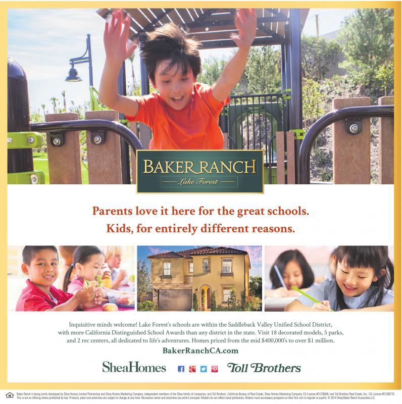 Parents love it here for the great schools. Kids, for entirely different reasons. Inquisitive minds welcome! Lake Forest’s schools are within the Saddleback Valley Unified School District, with more California Distinguished School Awards than any district in the state. Visit 18 decorated models, 5 parks, and 2 rec centers, all dedicated to life’s adventures. Homes priced from the mid $400,000’s to over $1 million. BakerRanchCA.com Baker Ranch is being jointly developed by Shea Homes Limited Partnership and Shea Homes Marketing Company,independent members of the Shea family of companies, and Toll Brothers. California Bureau of Real Estate, Shea Homes Marketing Company,CALicense #01378646, and Toll Brothers Real Estate, Inc., CA License #01206770. This is not an offering where prohibited by law.Products, plans and amenities are subject to change at any time. Recreation center and amenities are artist’sconcepts. Models do not reflect racial preference. Brokers must accompany prospects on their first visit to register to qualify.©2014 Shea/Baker Ranch Associates LLC.