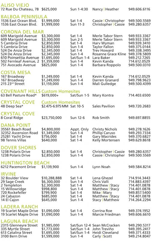 ALISO VIEJO 72 Rue Du Chateau, 78 $625,000 Sun 1-4:30 Nancy | Heather 949.606.6116 BALBOA PENINSULA 1536 East Ocean Blvd. $1,999,000 Sat 1-4 Cassie | Christopher 949.500.5569 1536 East Ocean Blvd. $1,999,000 Sun 11-3 Christopher | Cassie 949.280.6357 CORONA DEL MAR 609 Marigold Avenue $3,300,000 Sat 1-4 Merle Tabor Stern 949.933.3367