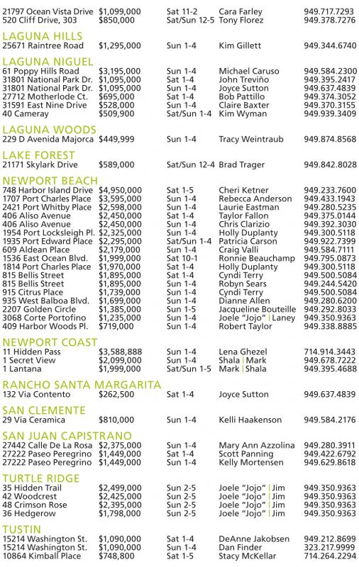 21797Ocean VistaDrive $1,099,000 Sat 11-2 Cara Farley 949.717.7293 520 Cliff Drive, 303 $850,000 Sat/Sun 12-5 Tony Florez 949.378.7276 LAGUNA HILLS 25671 Raintree Road $1,295,000 Sun 1-4 Kim Gillett 949.344.6740 LAGUNA NIGUEL 61 Poppy Hills Road $3,195,000 Sun 1-4 Michael Caruso 949.584.2300 31801 National Park Dr. $1,095,000 Sat 1-4 John Treviño 949.395.2417 31801 National Park Dr. $1,095,000 Sun 1-4 Joyce Sutton 949.637.4839