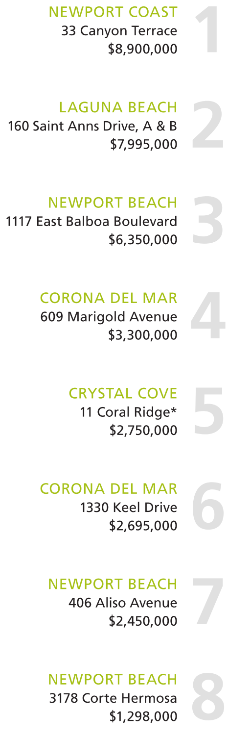 NEWPORT COAST 33 Canyon Terrace $8,900,000 LAGUNA BEACH 160 Saint Anns Drive, A & B $7,995,000 NEWPORT BEACH 1117 East Balboa Boulevard $6,350,000 1 2 3 CORONA DEL MAR 609 Marigold Avenue $3,300,000 CRYSTAL COVE 11 Coral Ridge* $2,750,000 4 5 CORONA DEL MAR 1330 Keel Drive $2,695,000 6 NEWPORT BEACH 406 Aliso Avenue $2,450,000 7 NEWPORT BEACH 3178 Corte Hermosa $1,298,000 8