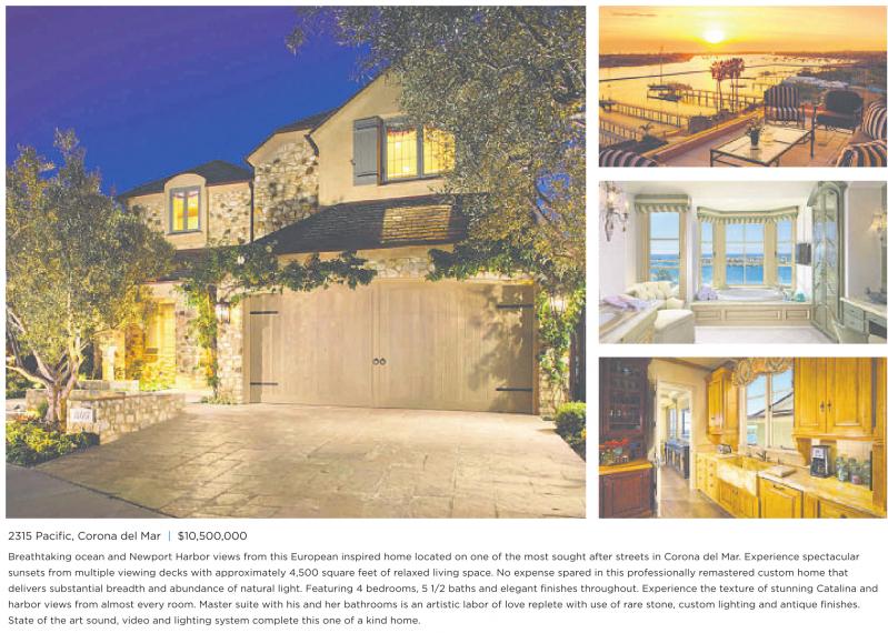 2315 Pacific, Corona del Mar | $10,500,000 Breathtaking ocean and Newport Harbor views from this European inspired home located on one of the most sought after streets in Corona del Mar. Experience spectacular sunsets from multiple viewing decks with approximately 4,500 square feet of relaxed living space. No expense spared in this professionally remastered custom home that delivers substantial breadth and abundance of natural light. Featuring 4 bedrooms, 5 1/2 baths and elegant finishes throughout. Experience the texture of stunning Catalina and harbor views from almost every room. Master suite with his and her bathrooms is an artistic labor of love replete with use of rare stone, custom lighting and antique finishes. State of the art sound, video and lighting system complete this one of a kind home.