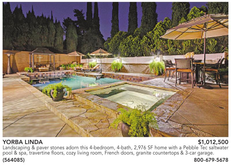 YORBA LINDA $1,012,500 Landscaping & paver stones adorn this 4-bedroom, 4-bath, 2,976 SF home with a Pebble Tec saltwater pool & spa, travertine floors, cozy living room, French doors, granite countertops & 3-car garage. (564085) 800-679-5678