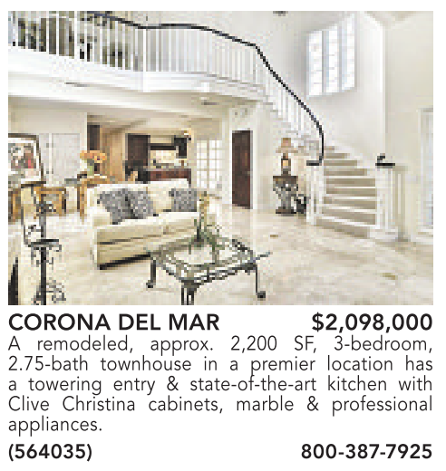 CORONA DEL MAR $2,098,000 A remodeled, approx. 2,200 SF, 3-bedroom, 2.75-bath townhouse in a premier location has a towering entry & state-of-the-art kitchen with Clive Christina cabinets, marble & professional appliances. (564035) 800-387-7925