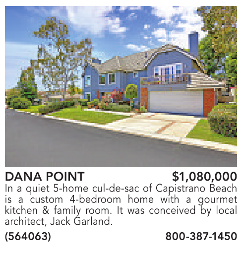 DANA POINT $1,080,000 In a quiet 5-home cul-de-sac of Capistrano Beach is a custom 4-bedroom home with a gourmet kitchen & family room. It was conceived by local architect, Jack Garland. (564063) 800-387-1450