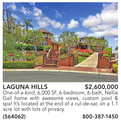 LAGUNA HILLS $2,600,000 One-of-a-kind, 6,000 SF, 6-bedroom, 6-bath, Nellie Gail home with awesome views, custom pool & spa! It’s located at the end of a cul-de-sac on a 1.1 acre lot with lots of privacy. (564062) 800-387-1450