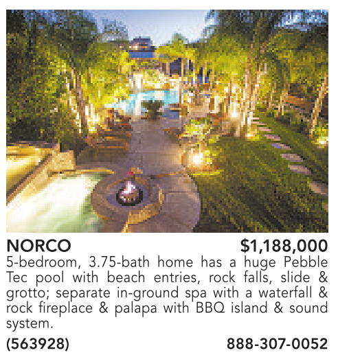 NORCO $1,188,000 5-bedroom, 3.75-bath home has a huge Pebble Tec pool with beach entries, rock falls, slide & grotto; separate in-ground spa with a waterfall & rock fireplace & palapa with BBQ island & sound system.