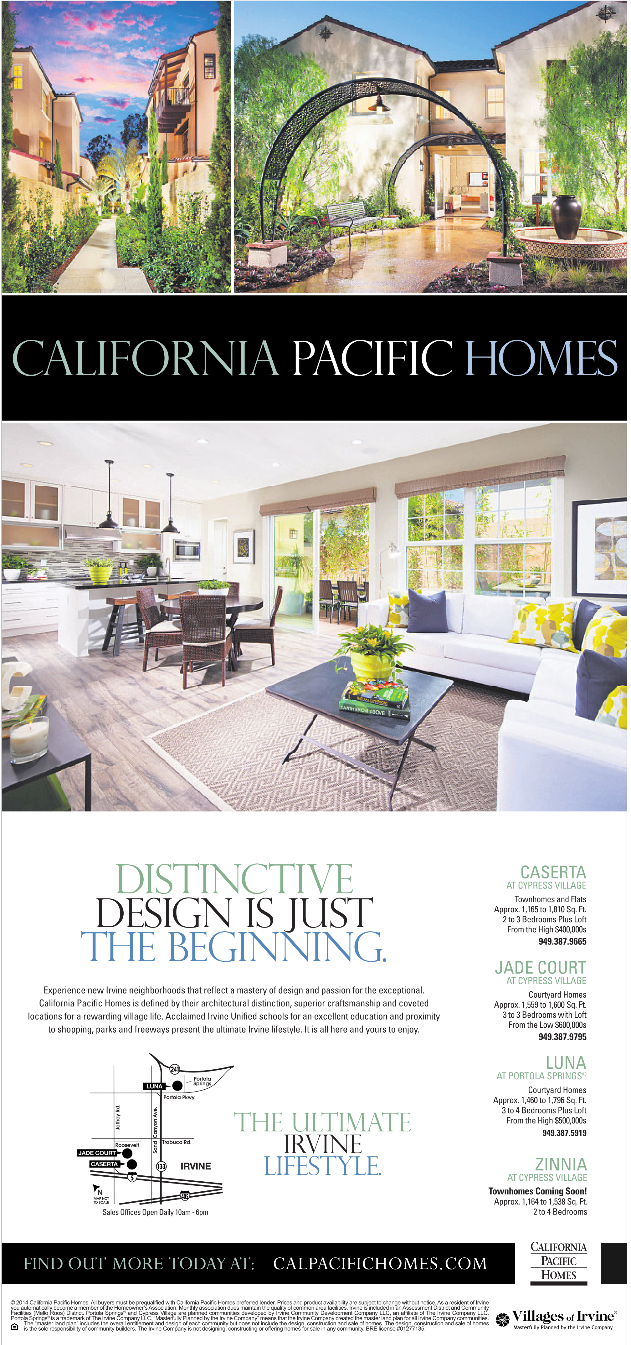 JS2 SUNDAY, AUGUST 10, 2014 OC LOS ANGELES TIMES CALIFORNIA PACIFIC HOMES DISTINCTIVE DESIGN IS JUST THE BEGINNING. Experience new Irvine neighborhoods that reflect a mastery of design and passion for the exceptional. California Pacific Homes is defined by their architectural distinction, superior craftsmanship and coveted locations for a rewarding village life. Acclaimed Irvine Unified schools for an excellent education and proximity to shopping, parks and freeways present the ultimate Irvine lifestyle. It is all here and yours to enjoy. CASERTA AT CYPRESS VILLAGE Townhomes and Flats Approx. 1,165 to 1,810 Sq. Ft. 2to3Bedrooms Plus Loft From the High $400,000s 949.387.9665 JADE COURT AT CYPRESS VILLAGE Courtyard Homes Approx. 1,559 to 1,600 Sq. Ft. 3to3Bedrooms with Loft From the Low $600,000s 949.387.9795 LUNA JADE COURT CASERTA IRVINE N MAP NOT TO SCALE Sales Offices Open Daily 10am -6pm THE ULTIMATE IRVINE LIFESTYLE. LUNA AT PORTOLA SPRINGS ® Courtyard Homes Approx. 1,460 to 1,796 Sq. Ft. 3to4Bedrooms Plus Loft From the High $500,000s 949.387.5919 ZINNIA AT CYPRESS VILLAGE Townhomes Coming Soon! Approx. 1,164 to 1,538 Sq. Ft. 2to4Bedrooms FIND OUT MORE TODAY AT: CALPACIFICHOMES.COM ® ®