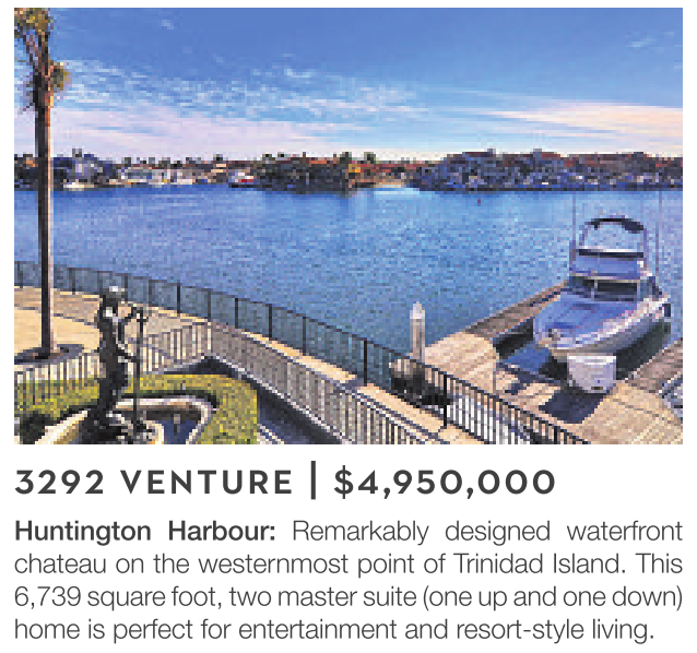 Huntington Harbour: Remarkably designed waterfront chateau on the westernmost point of Trinidad Island. This 6,739 squarefoot, two master suite (one up and one down) home is perfect for entertainment and resort-style living.