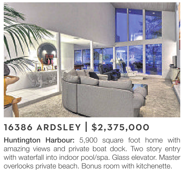 Huntington Harbour: 5,900 square foot home with amazing views and private boat dock. Two story entry with waterfall into indoor pool/spa. Glass elevator. Master overlooks private beach. Bonus room with kitchenette.