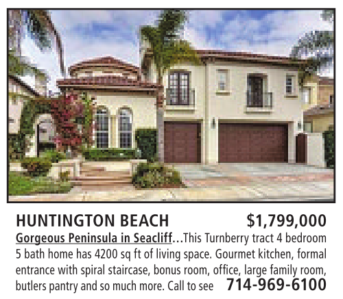 HUNTINGTON BEACH $1,799,000 Gorgeous Peninsula in Seacliff…This Turnberry tract 4bedroom 5bath home has 4200 sqftofliving space. Gourmet kitchen, formal entrance with spiral staircase, bonus room, office, large family room, butlerspantryand so muchmore.Calltosee 714-969-6100