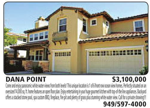 DANA POINT $3,100,000 Come and enjoy panoramicwhitewaterviewsfrom both levels!This unique locationis1of6frontrow ocean view homes. Perfectly situatedonan oversized14,000 sq. ft.home features an openfloor plan. Enjoy entertaininginyour huge gourmet kitchen with top-of-the line appliances. Backyard offersastacked stone pool, spacustomBBQ,fireplace,fire pit andplentyofgrassplusstunningwhitewaterview.Callfor aprivate showing!!!