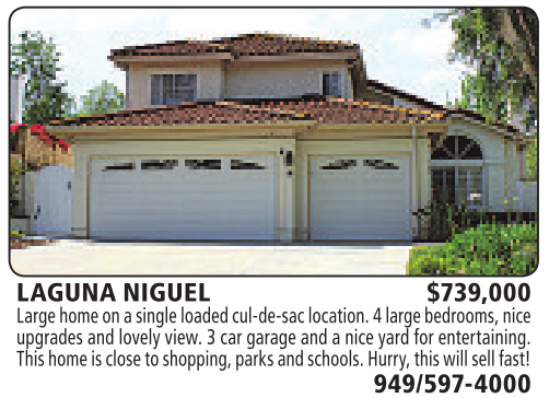 LAGUNA NIGUEL $739,000 Large homeonasingle loaded cul-de-sac location. 4large bedrooms,nice upgrades and lovely view. 3car garage and anice yard for entertaining. This homeisclose to shopping, parksand schools.Hurry,this will sell fast! 949/597-4000 See also