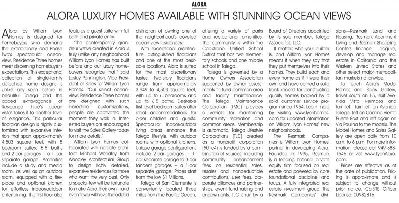 To reach Alora’s model Homes and sales gallery, travel south on i-5, exit Avenida vista Hermosa and turn left. Turn left on Avenida Talega, left on camino viento Fuerte east and left again on via Paulina to the models. The model Homes and sales gallery are open daily from 10 a.m. to 6 p.m. For more information, please call 949-388- 1546 or visit www.LyonAlora. com.