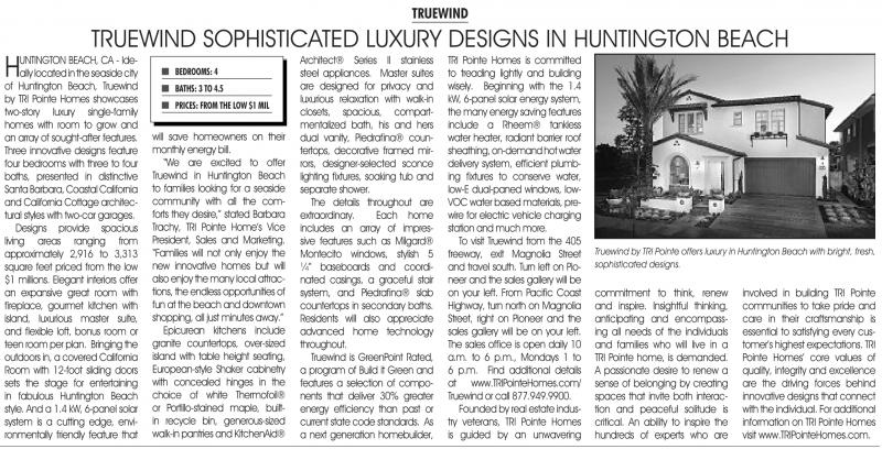 “We are excited to offer Truewind in Huntington Beach to families looking for a seaside community with all the comforts they desire,” stated Barbara Trachy, TRI Pointe Home’s Vice President, Sales and Marketing. “Families will not only enjoy the new innovative homes but will also enjoy the many local attractions, the endless opportunities of fun at the beach and downtown shopping, all just minutes away.”