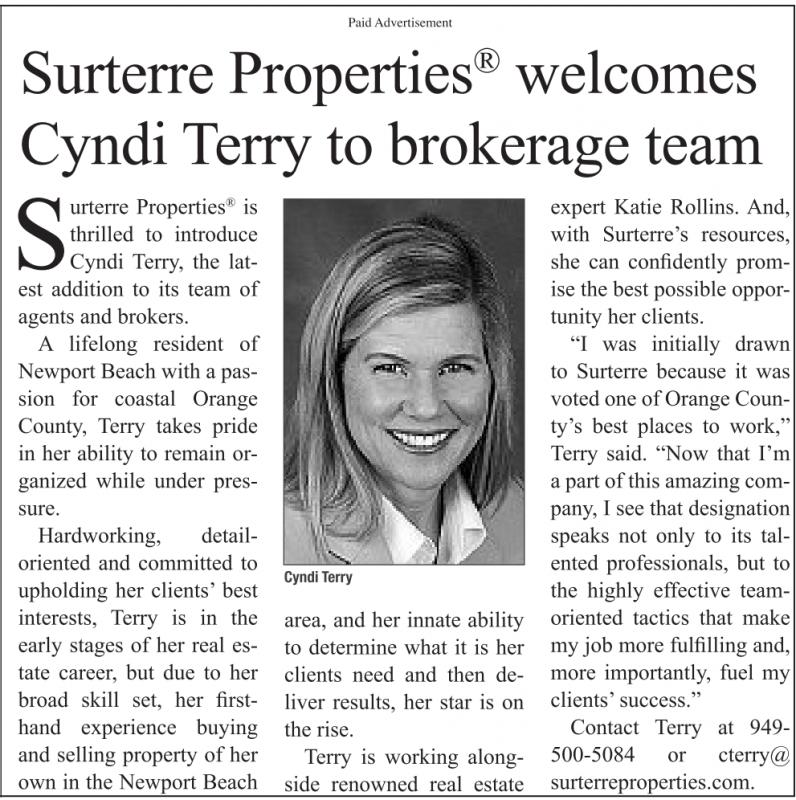 Surterre Properties ® is thrilled to introduce Cyndi Terry, the latest addition to its team of agents and brokers. A lifelong resident of Newport Beach with a passion for coastal Orange County, Terry takes pride in her ability to remain organized while under pressure. Hardworking, detailoriented and committed to upholding her clients’ best interests, Terry is in the early stages of her real estate career, but due to her broad skill set, her firsthand experience buying and selling property of her own in the Newport Beach Paid Advertisement Surterre Properties ® welcomes Cyndi Terry to brokerage team Cyndi Terry area, and her innate ability to determine what it is her clients need and then deliver results, her star is on the rise. Terry is working alongside renowned real estate expert Katie Rollins. And, with Surterre’s resources, she can confidently promise the best possible opportunity her clients. “I was initially drawn to Surterre because it was voted one of Orange County’s best places to work,” Terry said. “Now that I’m a part of this amazing company, I see that designation speaks not only to its talented professionals, but to the highly effective teamoriented tactics that make my job more fulfilling and, more importantly, fuel my clients’ success.” Contact Terry at 949- 500-5084 or cterry@ surterreproperties.com.
