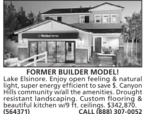 FORMER BUILDER MODEL! Lake Elsinore. Enjoy open feeling & natural light, superenergyefficienttosave$.Canyon Hills community w/all the amenities. Drought resistant landscaping. Custom flooring &beautiful kitchen w/9 ft. ceilings. $342,870. (564371) CALL (888) 307-0052