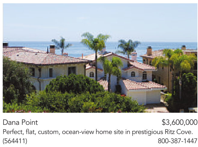 Dana Point $3,600,000 Perfect, flat, custom, ocean-view home site in prestigious Ritz Cove. (564411) 800-387-1447