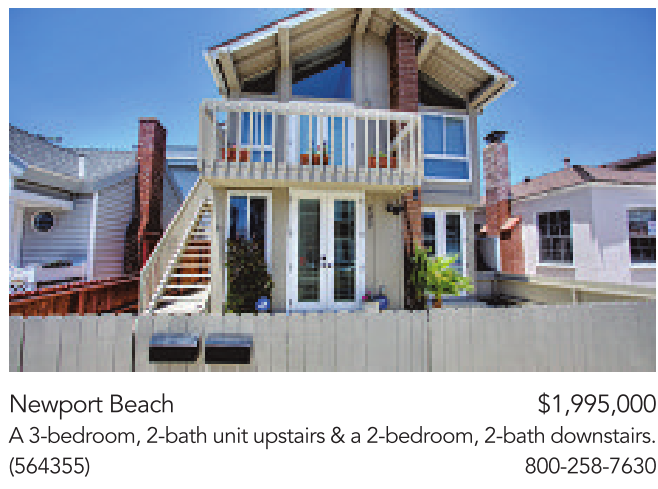 Newport Beach $1,995,000 A3-bedroom, 2-bath unit upstairs &a2-bedroom, 2-bath downstairs. (564355) 800-258-7630