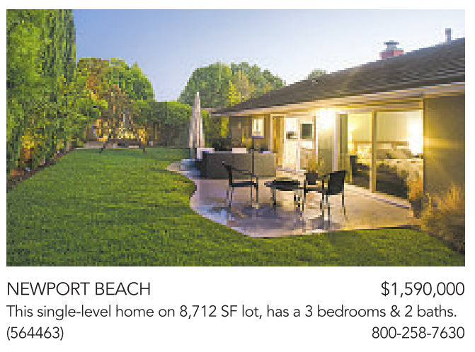 NEWPORT BEACH $1,590,000 This single-level home on 8,712 SF lot, has a3bedrooms &2baths. (564463) 800-258-7630