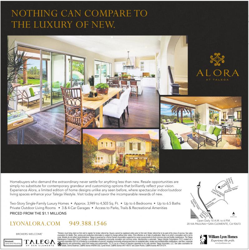 Homebuyers who demand the extraordinary never settle for anything less than new. Resale opportunities are simply no substitute for contemporary grandeur and customizing options that brilliantly reflect your vision. Experience Alora, a limited edition of home designs unlike any seen before, where spectacular indoor/outdoor living spaces enhance your Talega lifestyle. Visit today and savor the incomparable rewards of new.