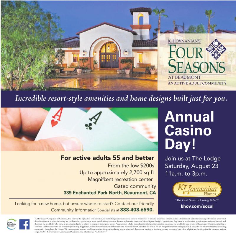 Incredible resort-style amenities and home designs built just for you. Annual Casino Day! For active adults 55 and better From the low $200s Up to approximately 2,700 sq ft Magnificent recreation center Gated community 339 Enchanted Park North, Beaumont CA Looking for a new home, but unsure where to start? Contact our friendly Community Information Specialists at 888-408-6590. Join us at The Lodge Saturday, August 23 11a.m. to 3p.m. khov.com/socal K. Hovnanian® Companies of California,Inc.reservesthe right, at its sole discretion, to makechanges or modificationswithout prior noticetoany and all contentset forthinthisadvertisement, and other ancillaryinformationuponwhich this advertisementisbased,including, butnot limited to,prices, maps, plans, specifications, materials, features and exterior elevations/colors. Squarefootage is approximate.Any home at an advertisedprice is subjecttoimmediate sale and, therefore, the availability of ahome at an advertised price issubject tochange without prior notice. Please contact aSales Consultant for the latest information concerning the availability and pricing ofhomes as well as the availability of amenities and facilities within thecommunity including, if applicable, information about anyrelatedassessments. Please see Sales Consultantfor details. We arepledged to theletterand spirit of U.S. policy forthe achievementofequal housing opportunitythroughout theNation. We encourage and support an affirmative advertisingand marketingprogram in whichthere arenobarrierstoobtaininghousingbecause of race,color,religion,sex,handicap, familial status, or national origin. ©2014 K. Hovnanian® Companies of California,Inc.BRE License No.01183847